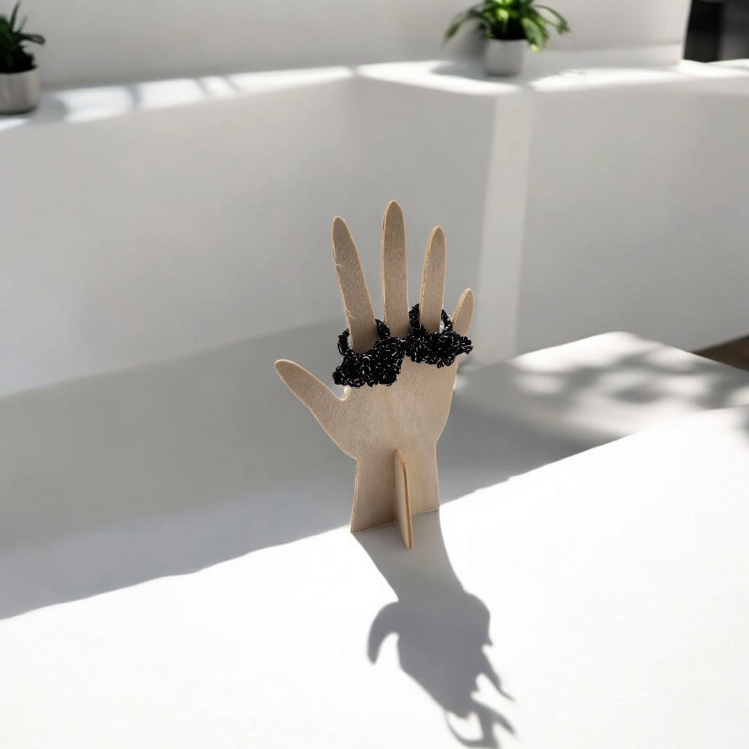 Minimaliste et sculpturale, cette bague est crochetée en fil à broder noir & argent. Disponible en deux modèles, elle joue avec la lumière et les volumes pour habiller vos doigts avec audace et originalité.