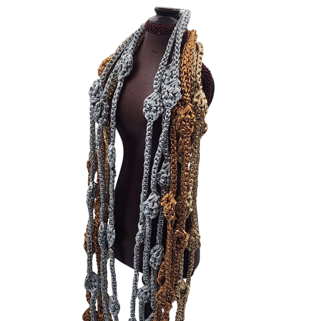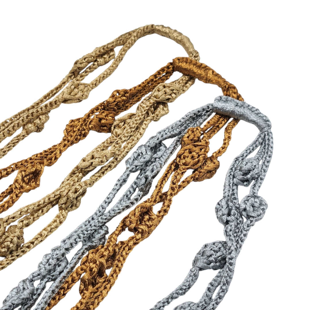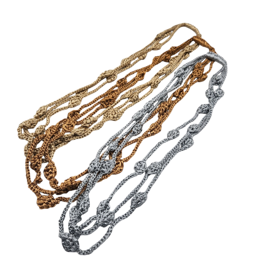 Ajoutez une touche d’élégance à votre tenue avec Sevilla III, un collier sautoir long crocheté en fil ruban, composé de trois rangs agrémentés de petites pastilles. Léger, raffiné et unique, il est disponible en trois couleurs pour s’adapter à tous les styles.
