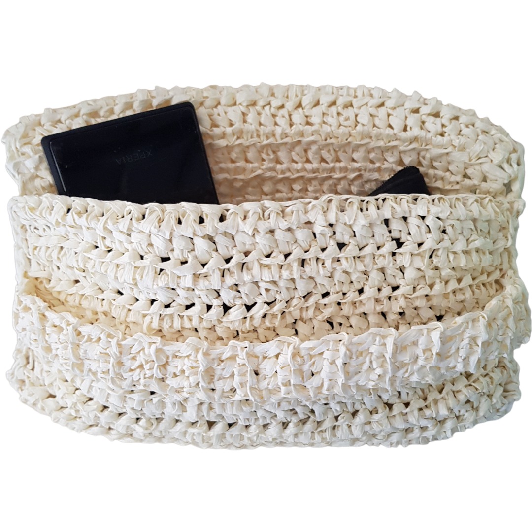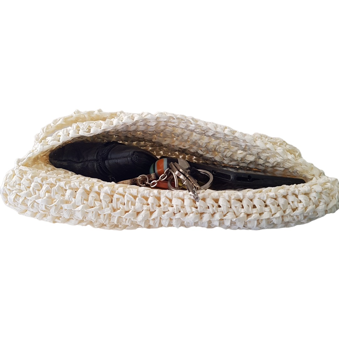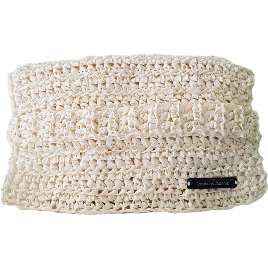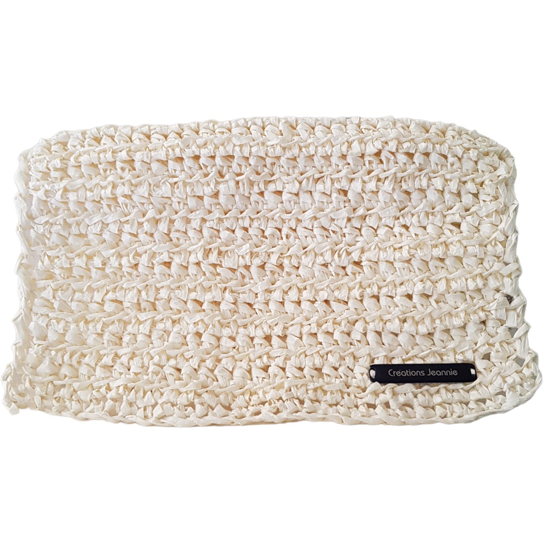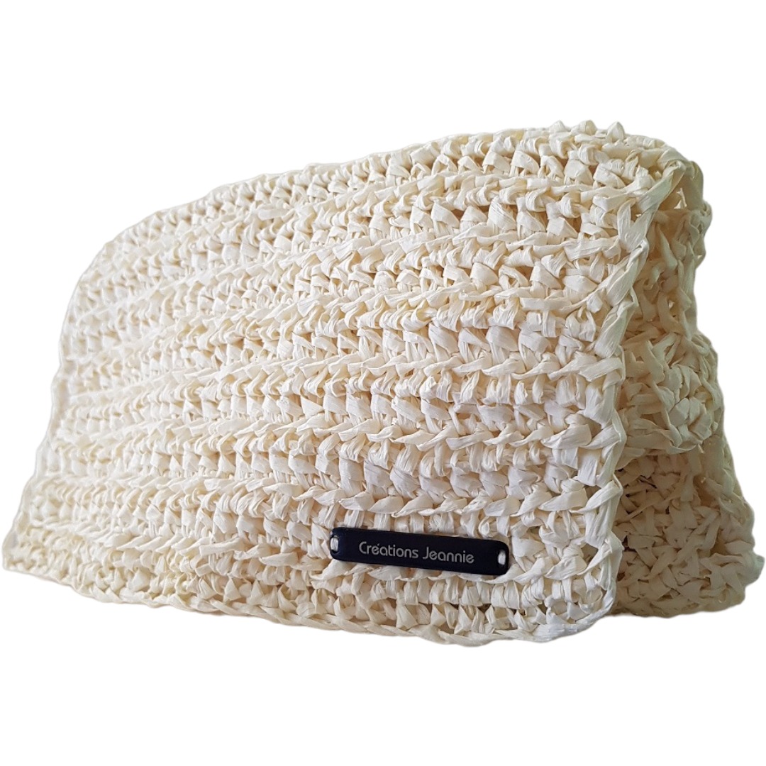 Pochette à main crochetée à la main en France avec du raphia blanc cassé.