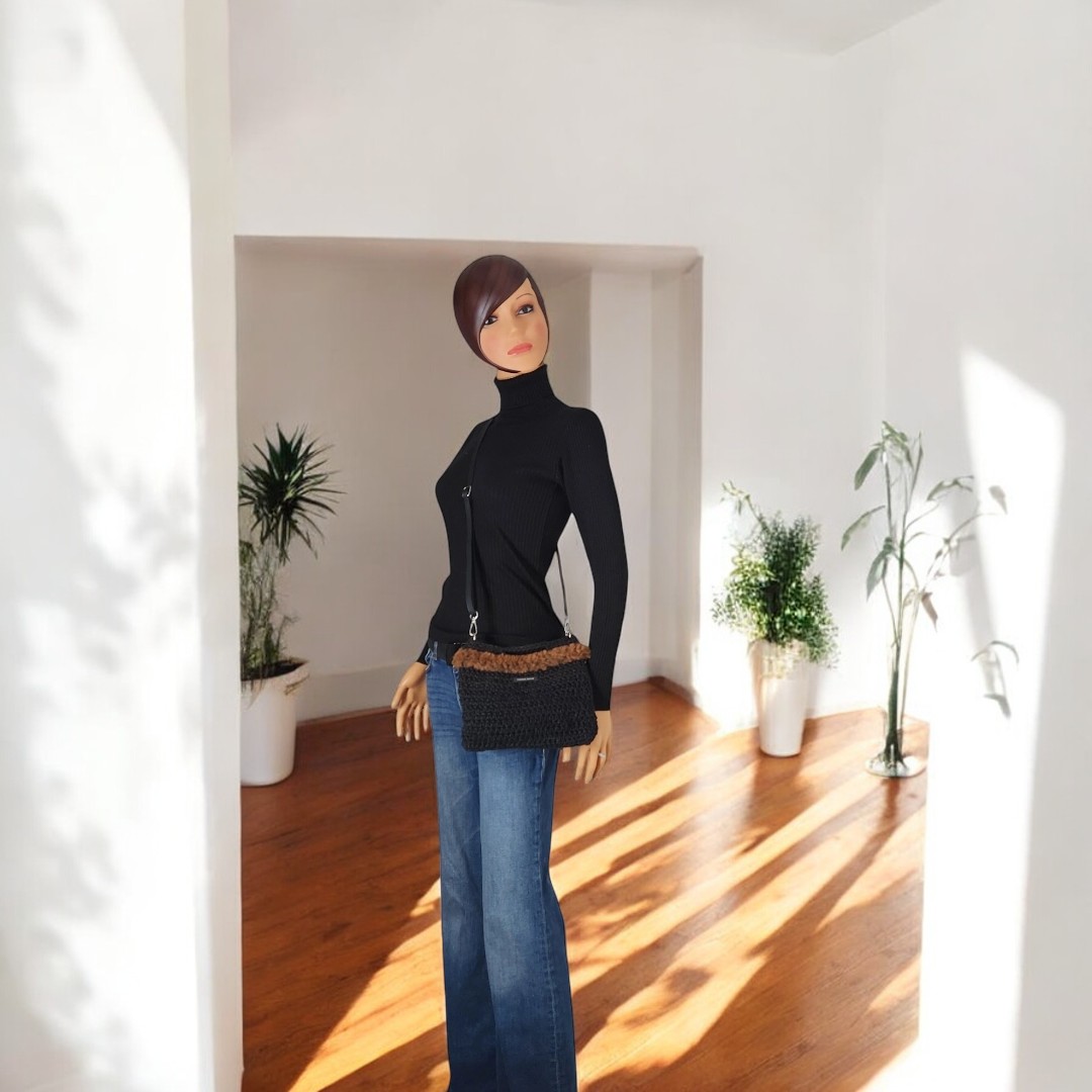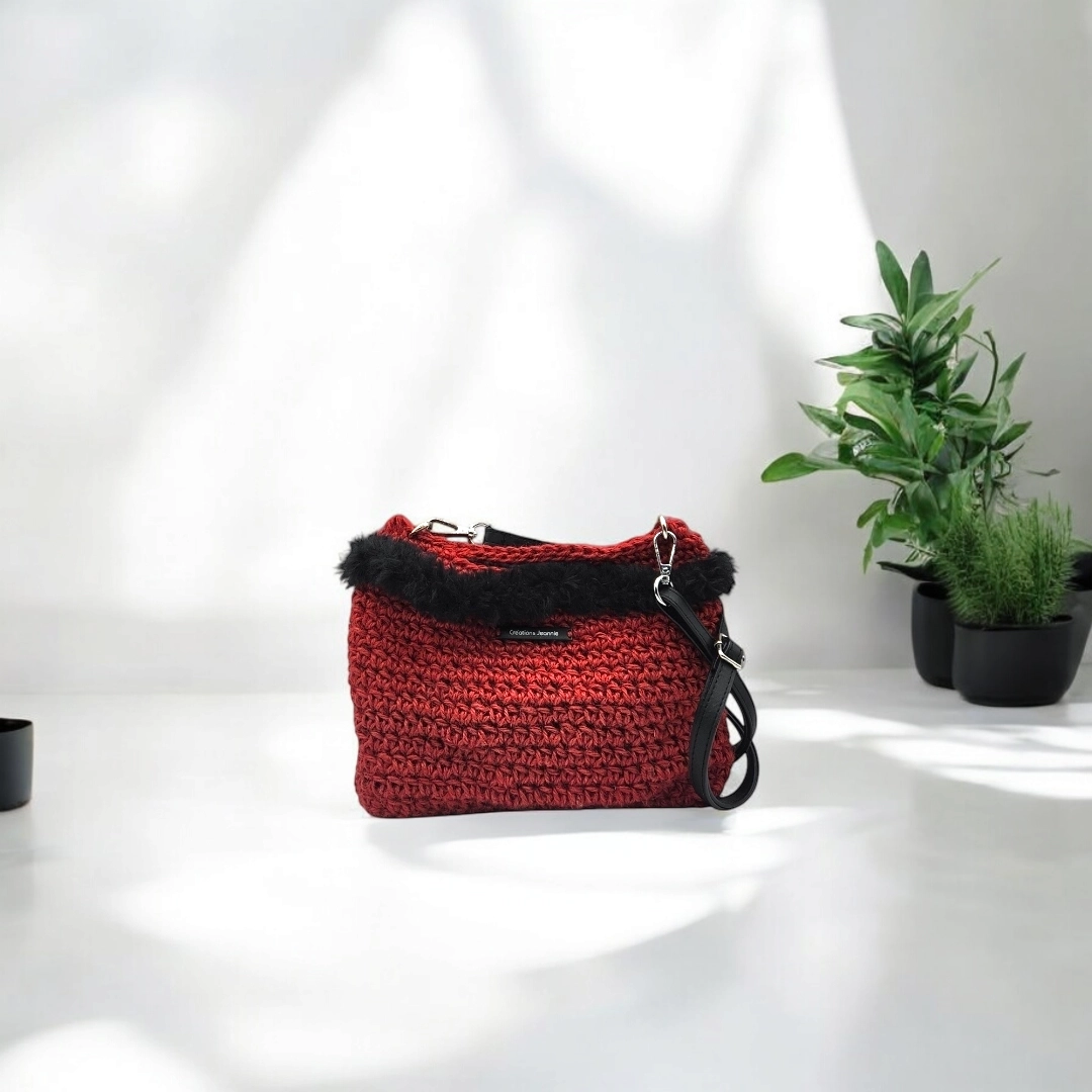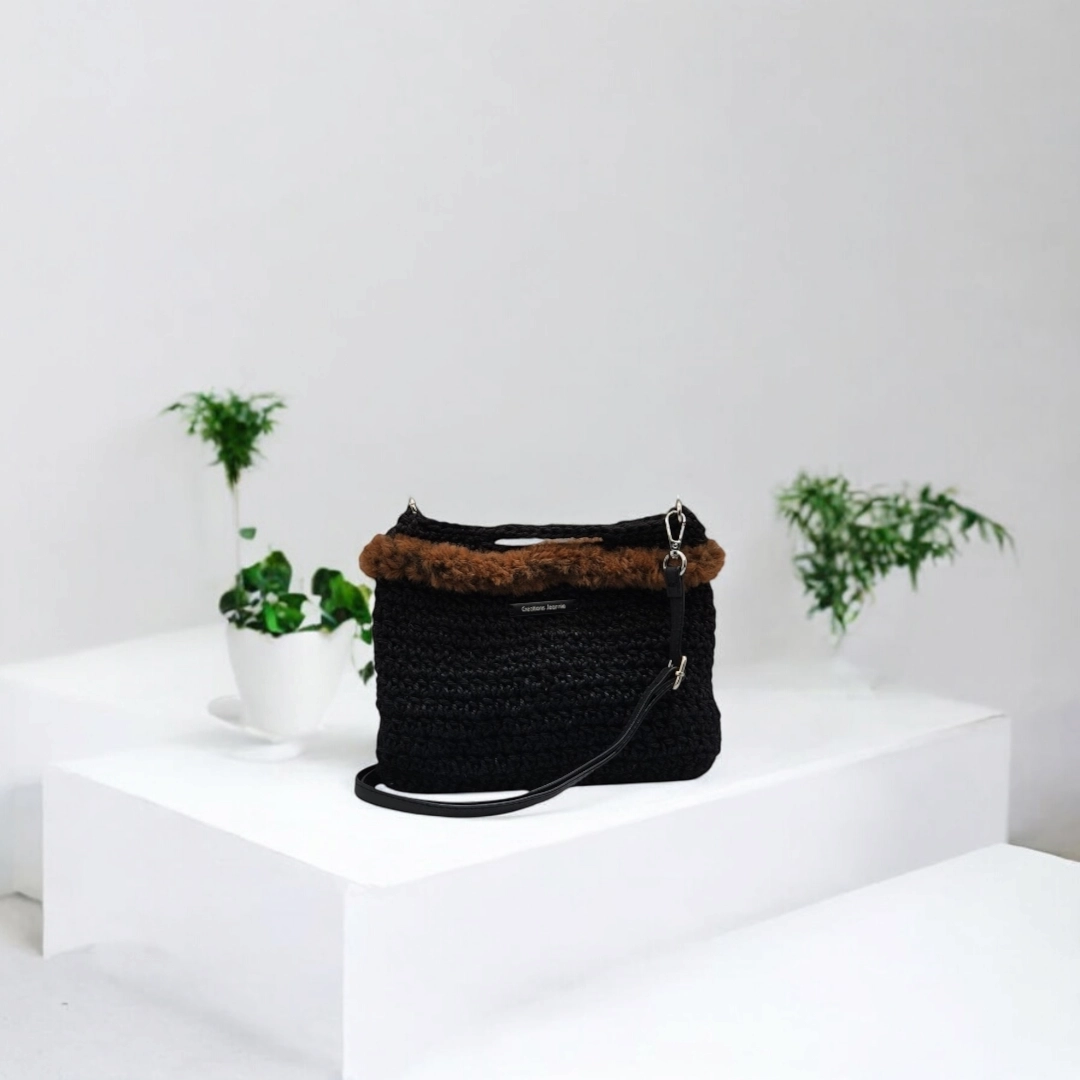Pochette crochetée en ficelle de jute et agrémentée de fausse fourrure. Polyvalente et pratique, avec sa bandoulière amovible en cuir noir, ainsi que sa petite anse, vous pourrez l’utiliser comme sac ou pochette à main.