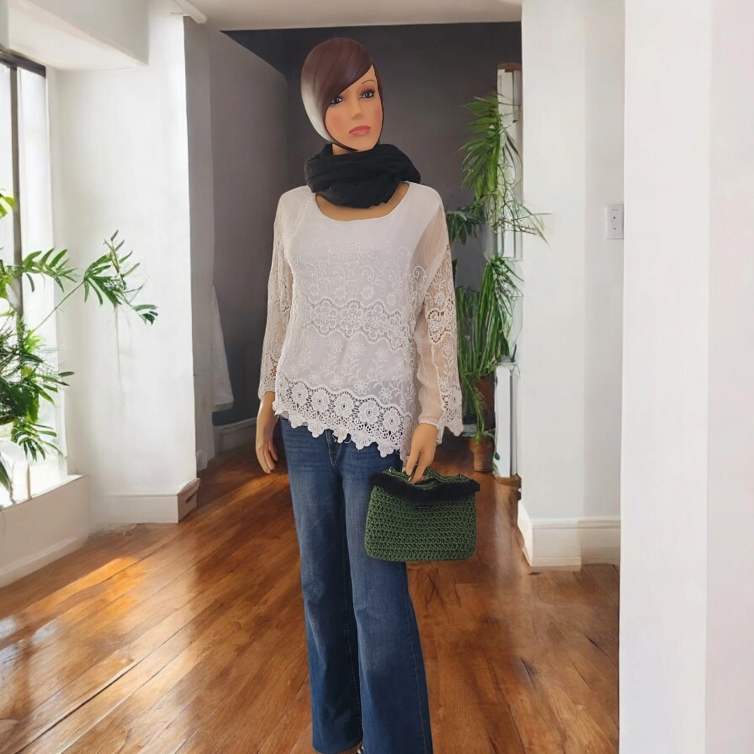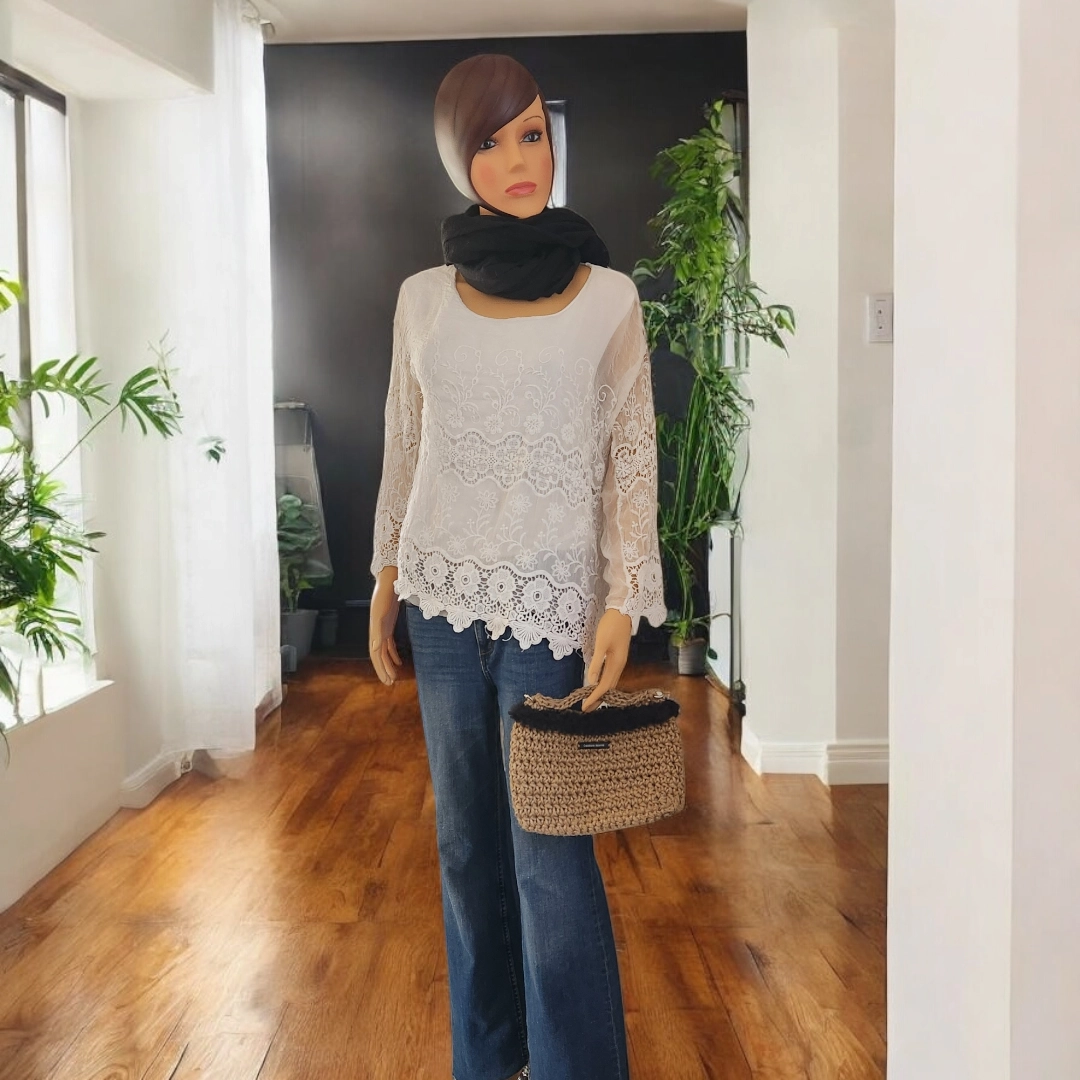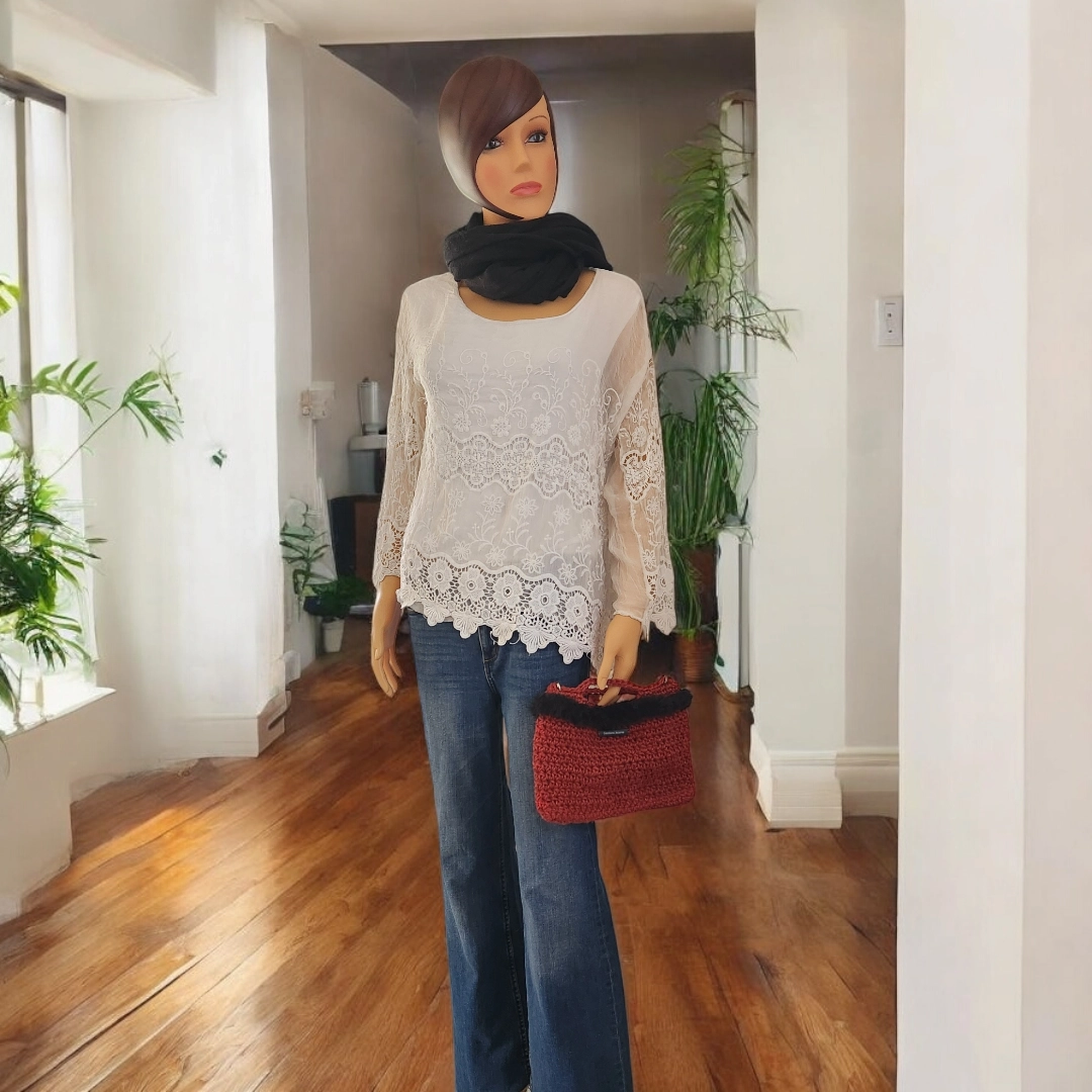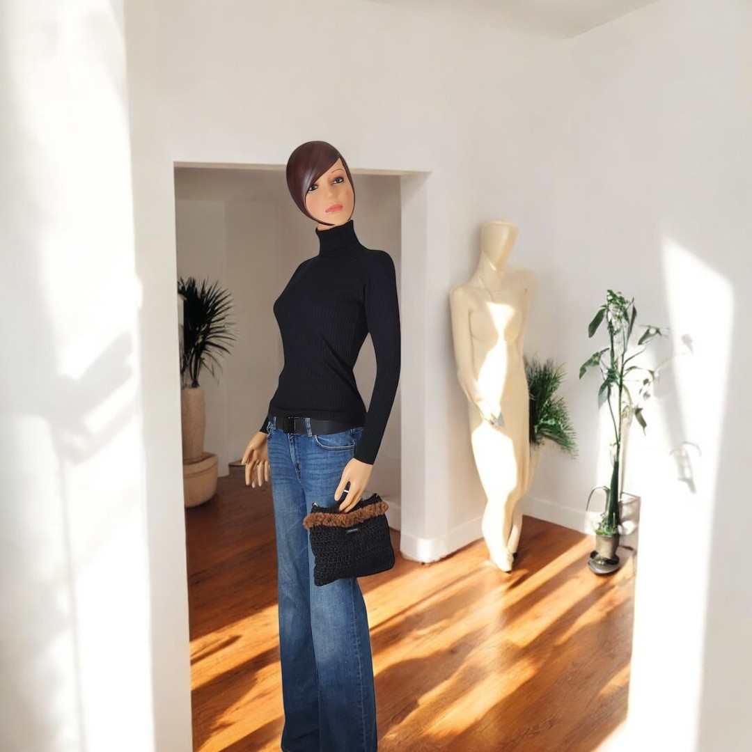 Pochette crochetée en ficelle de jute et agrémentée de fausse fourrure. Polyvalente et pratique, avec sa bandoulière amovible en cuir noir, ainsi que sa petite anse, vous pourrez l’utiliser comme sac ou pochette à main.