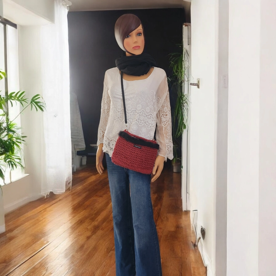Couverture vidéo pour Pochette crochetée en ficelle de jute (beige, kaki et rouge bordeaux) gansée de fausse fourrure noire avec bandoulière amovible en cuir noir