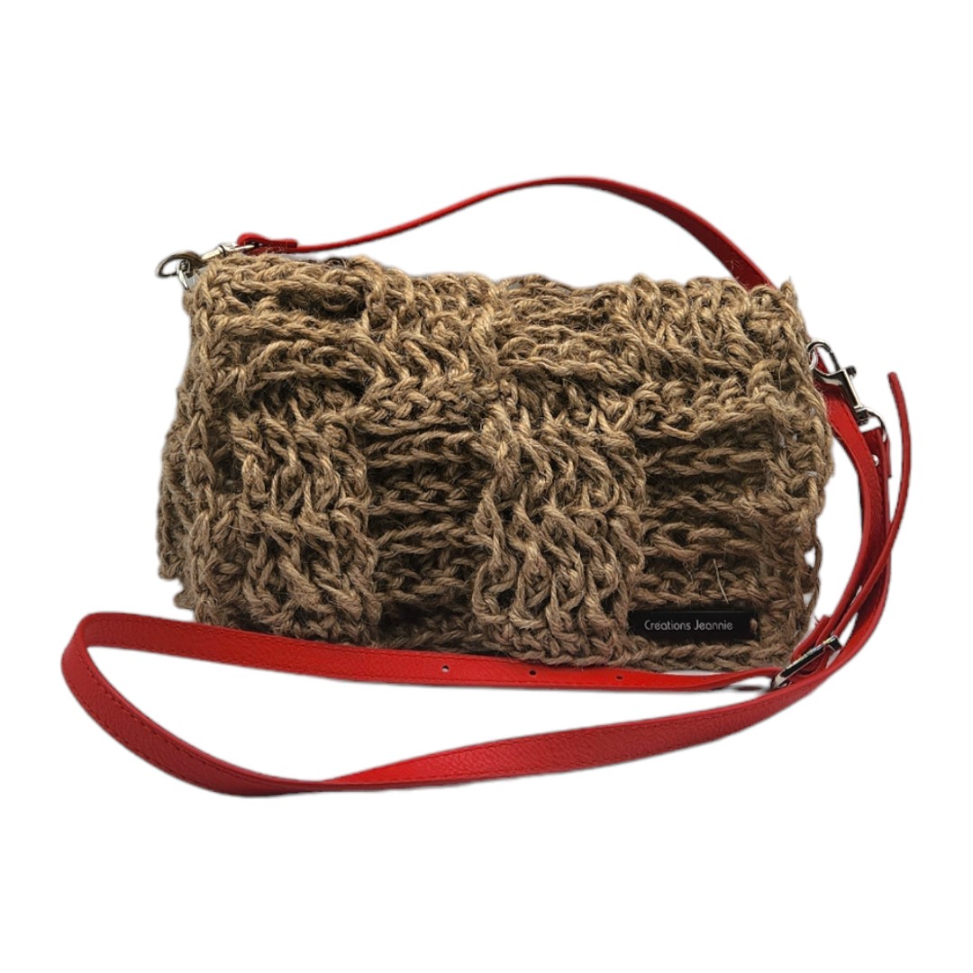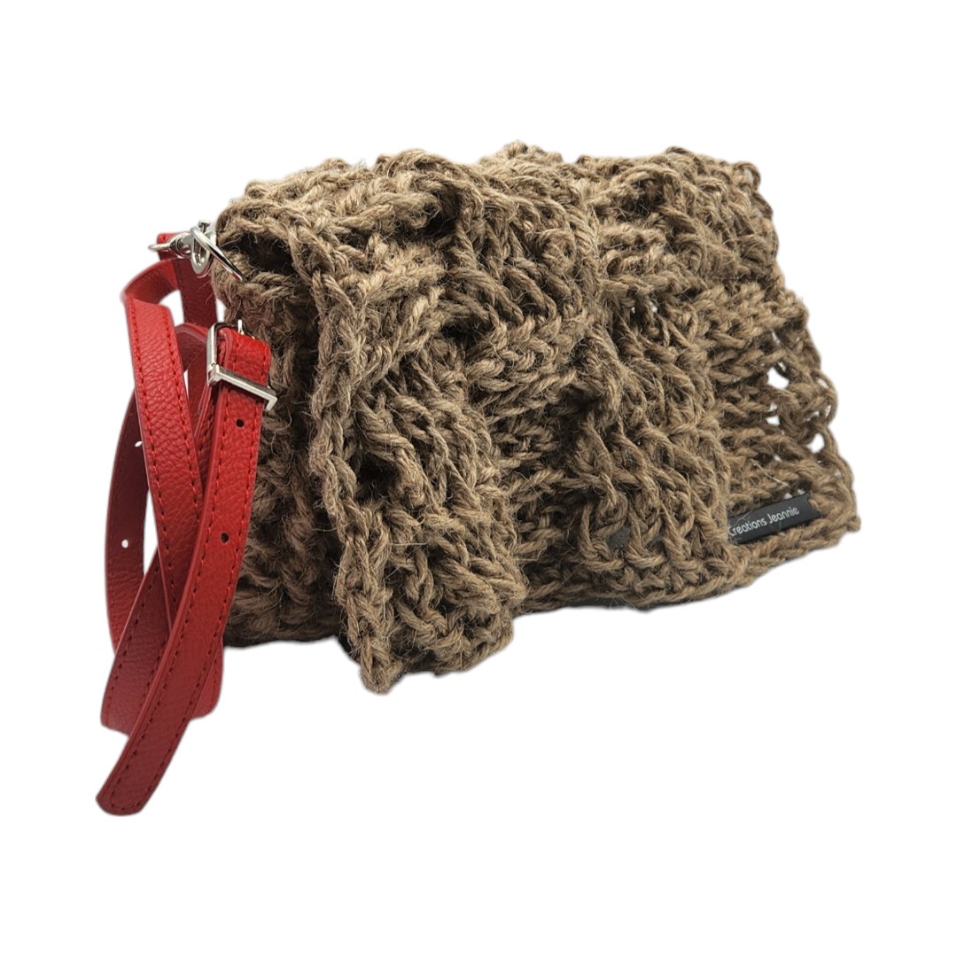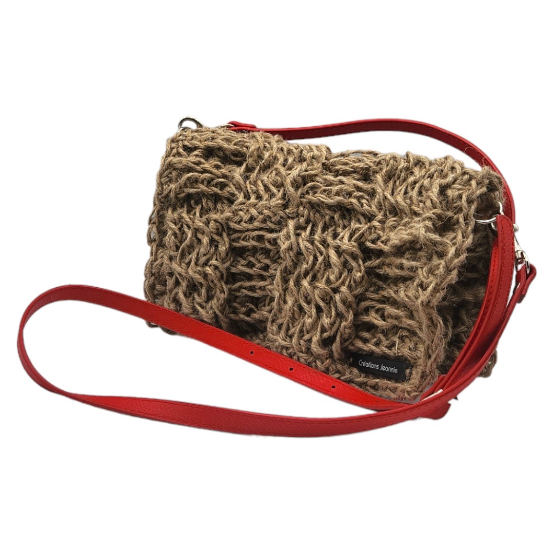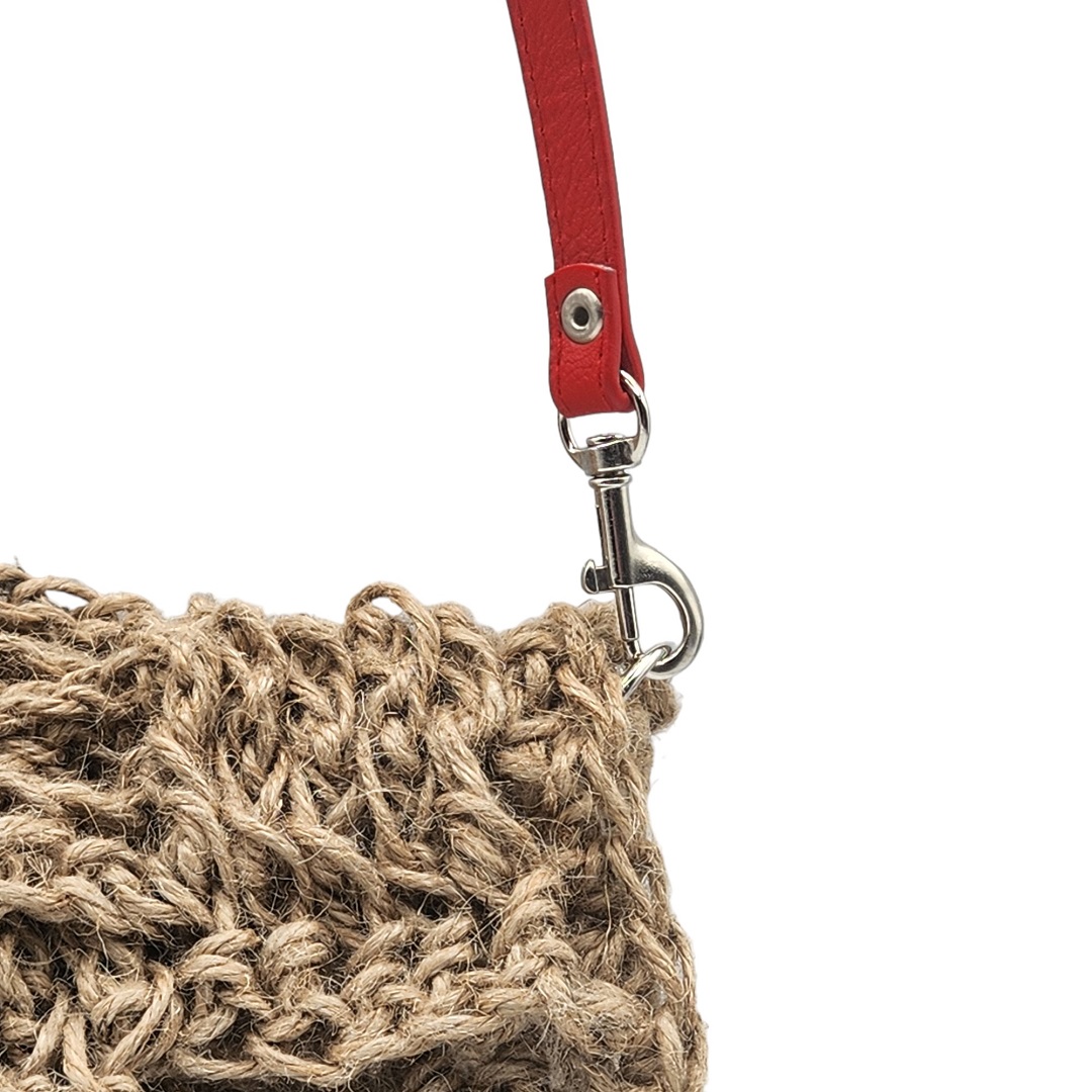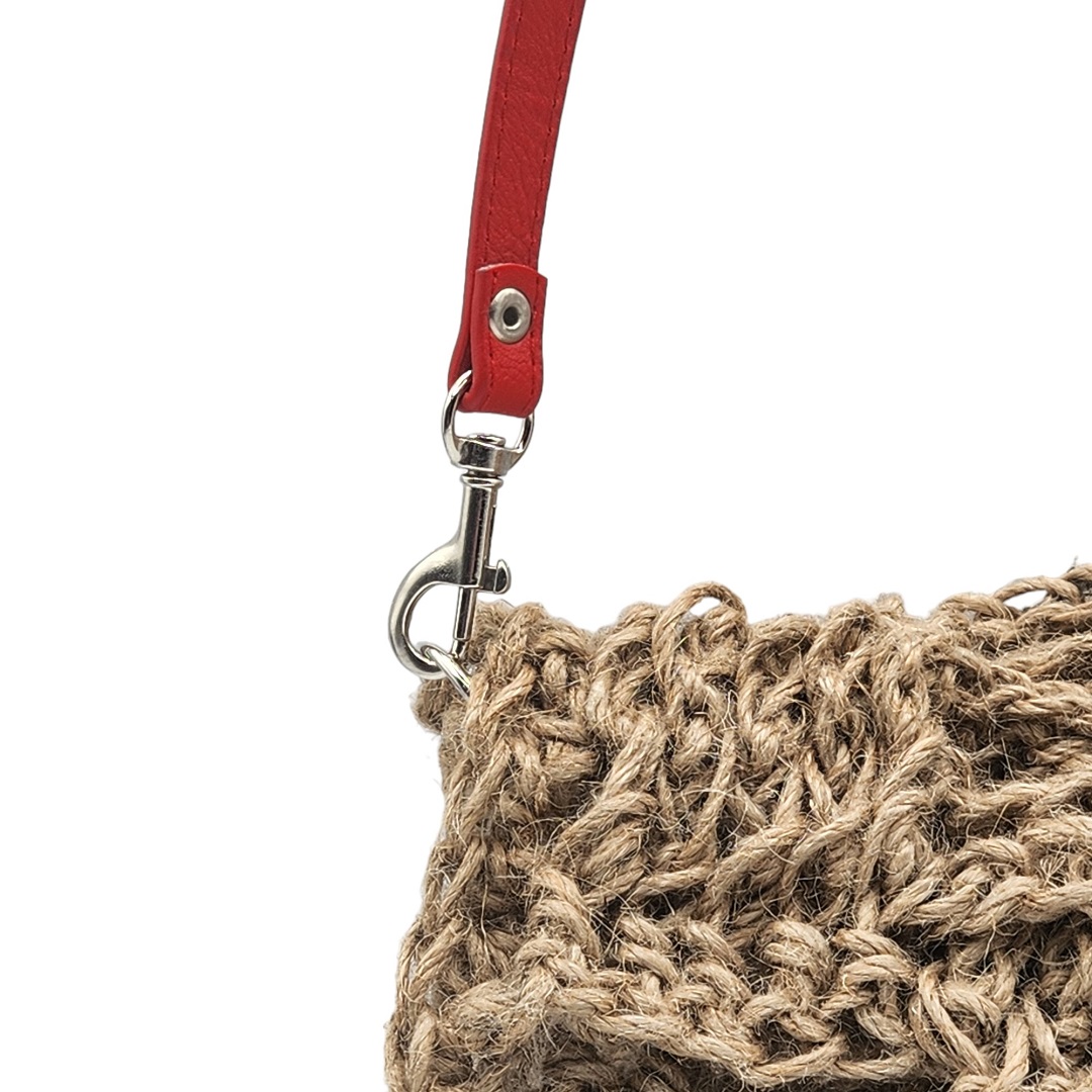couverture de la vidéo de présentation pour une Pochette besace crochetée en ficelle de jute beige avec anse bandoulière en cuir rouge