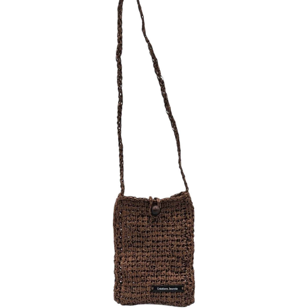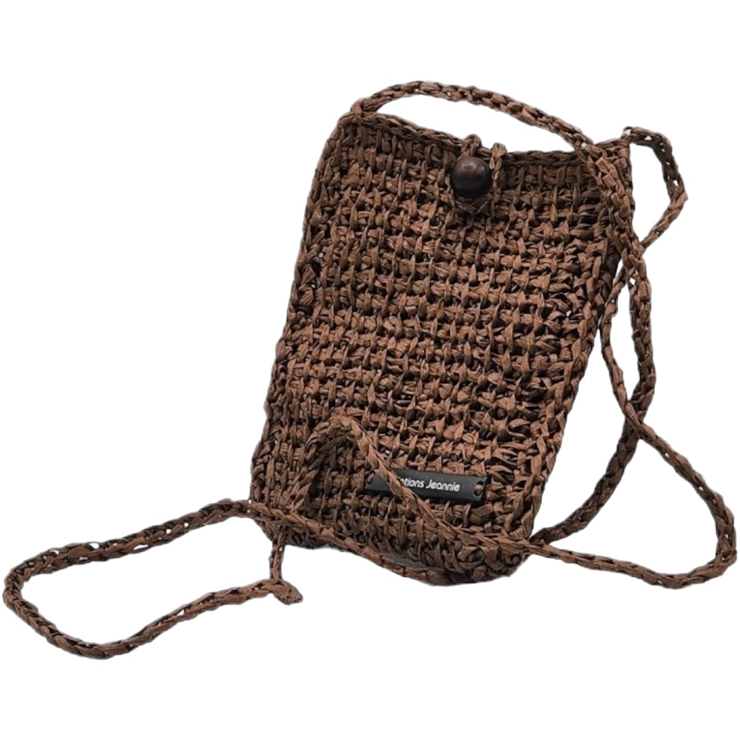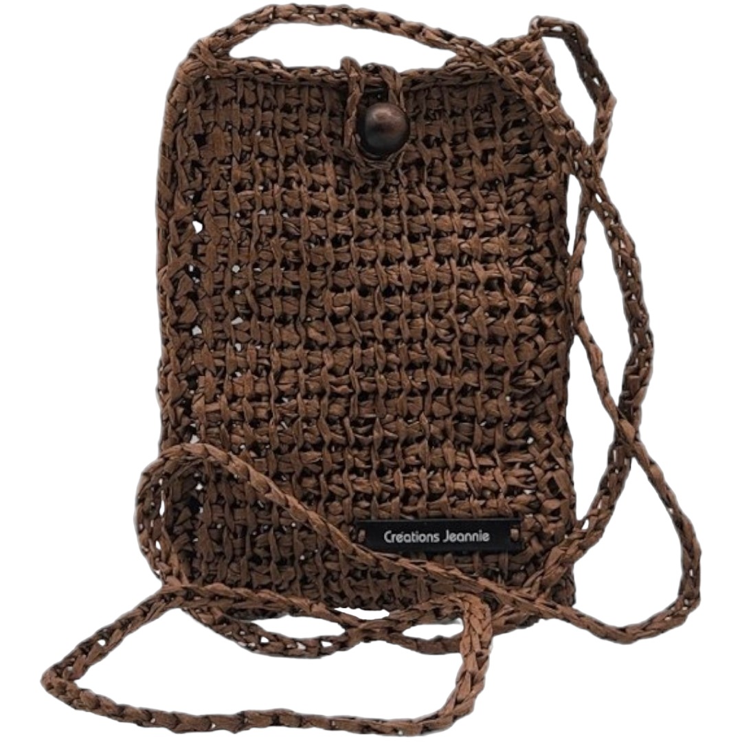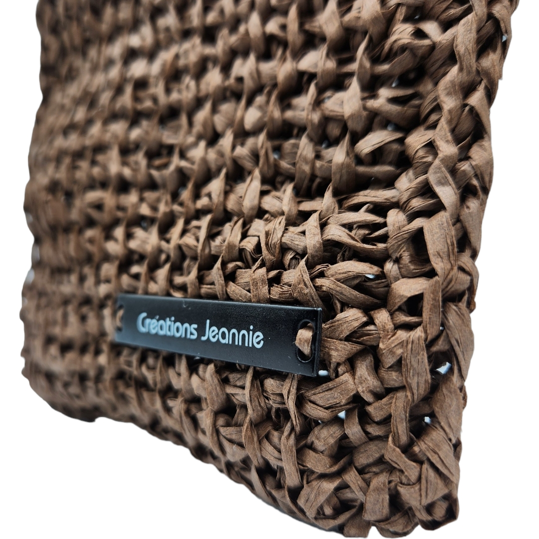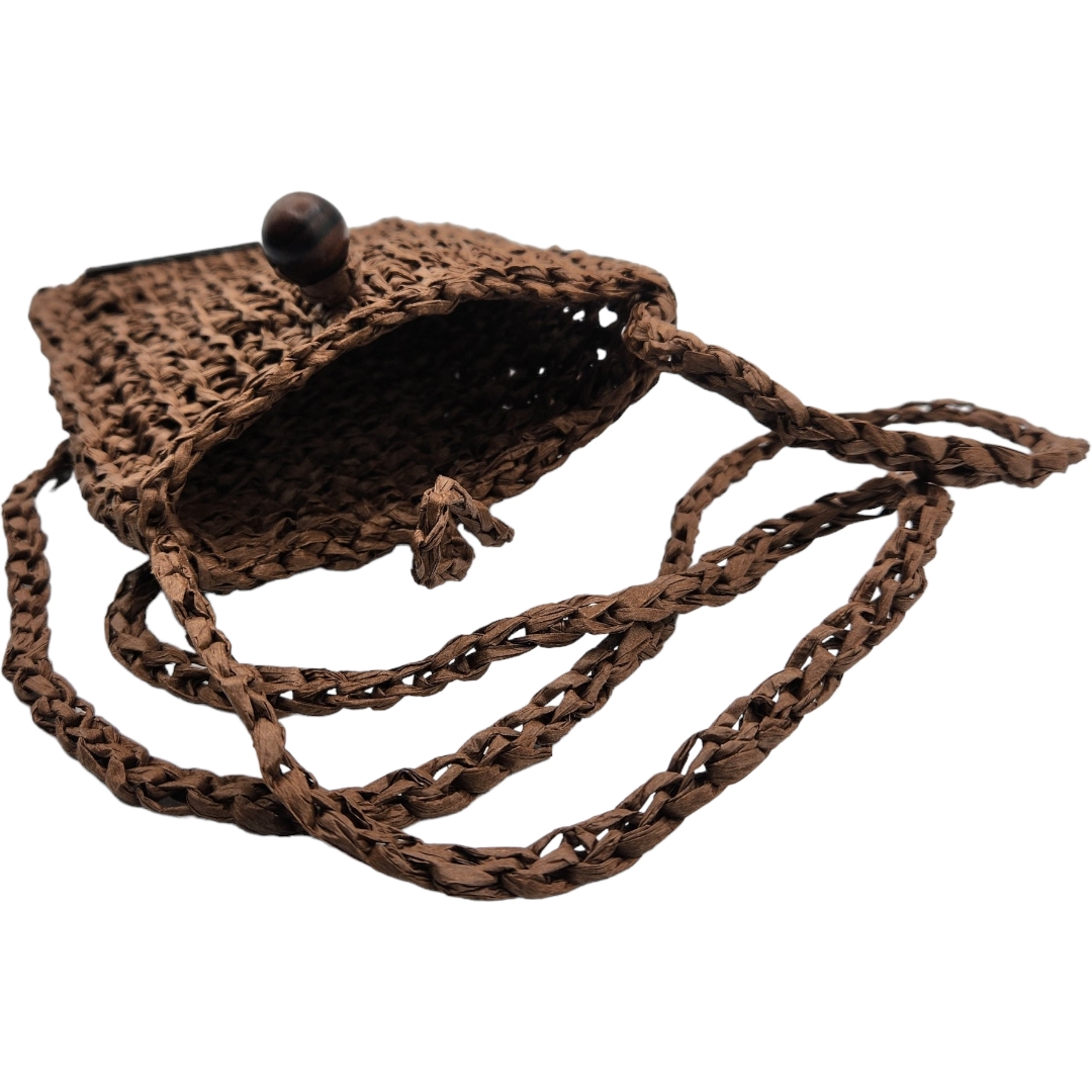 Pochette bandoulière crochetée en raphia papier marron chocolat avec son bouton en perle de bois qui sert de fermeture