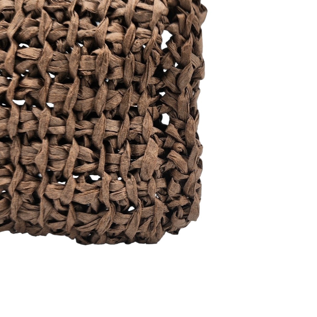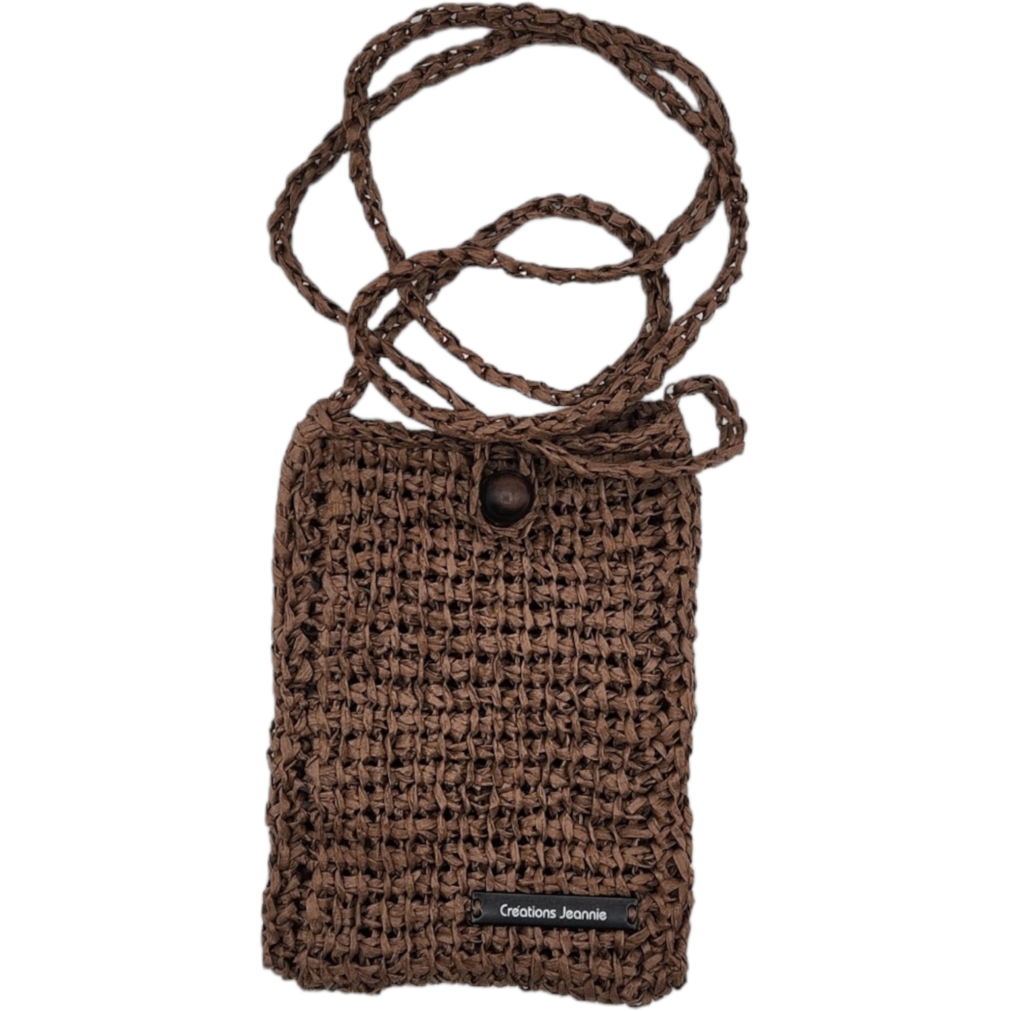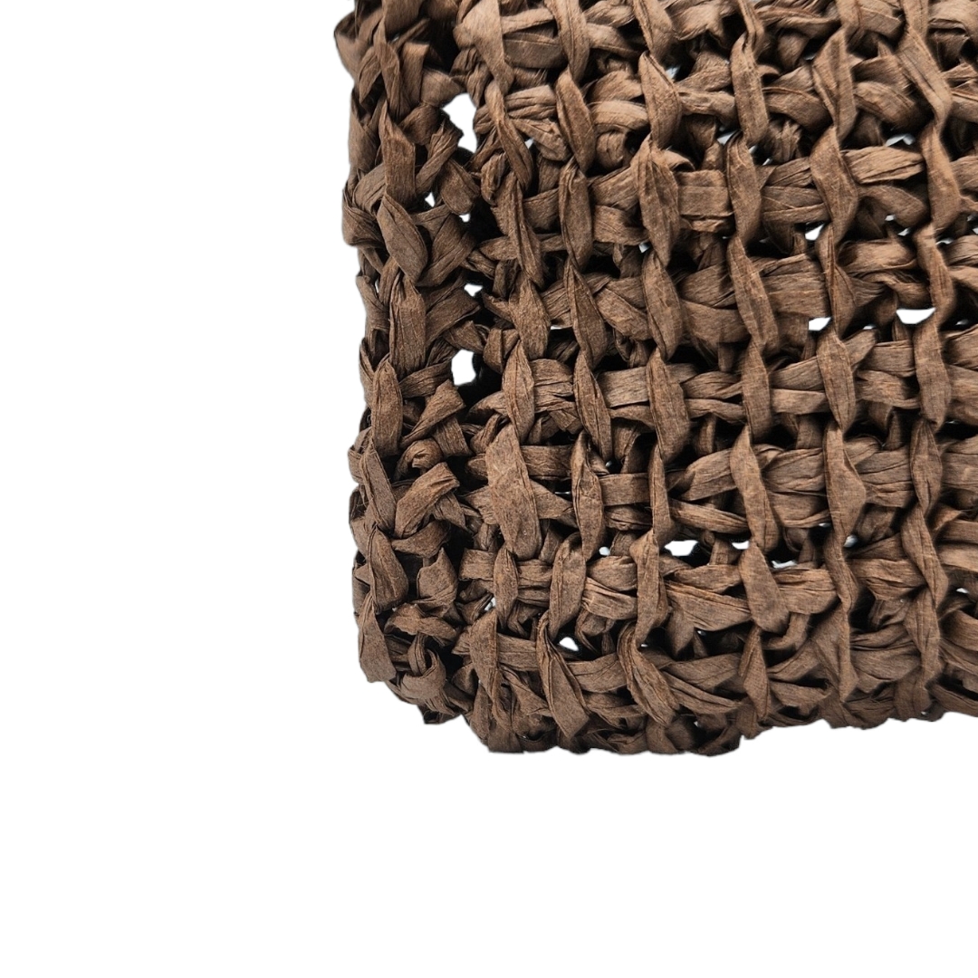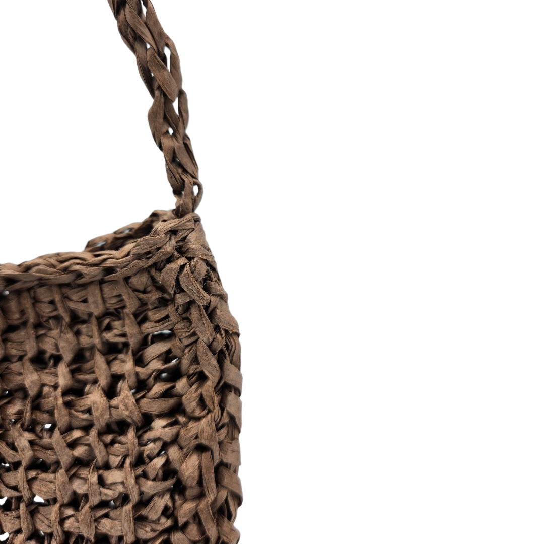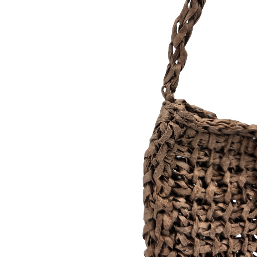 Pochette bandoulière crochetée en raphia papier marron chocolat avec son bouton en perle de bois qui sert de fermeture