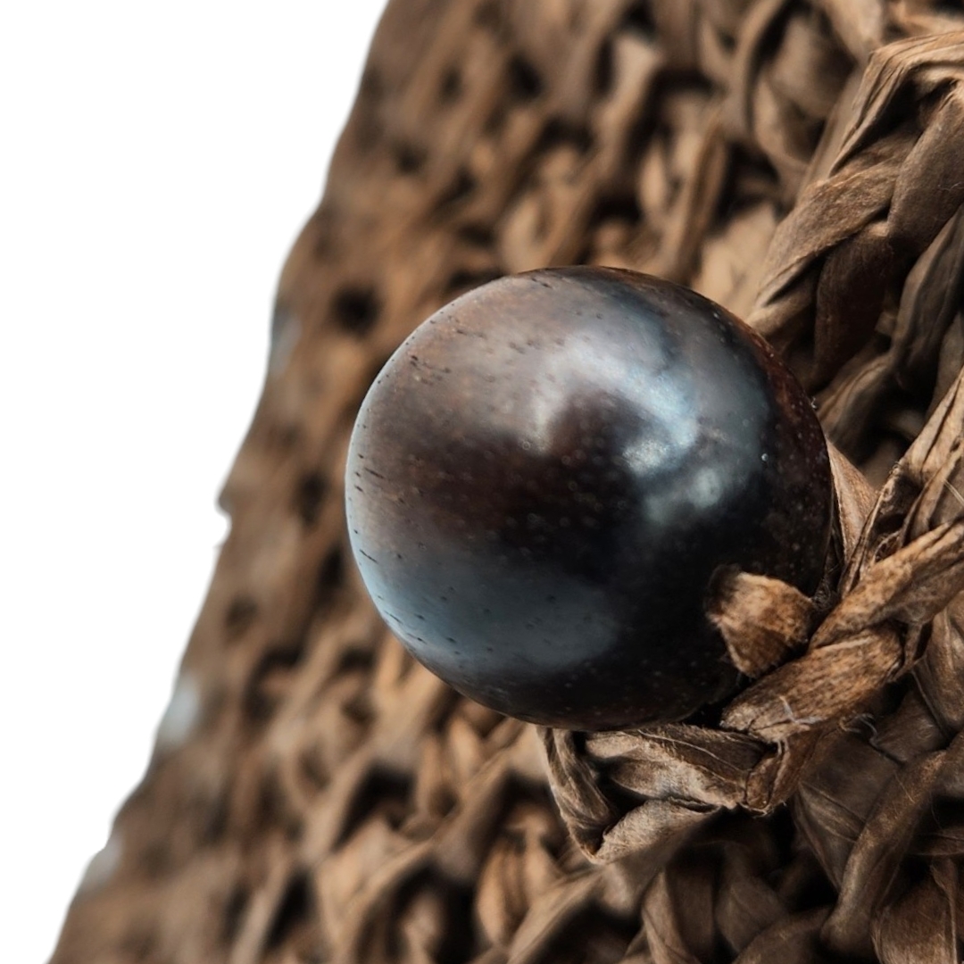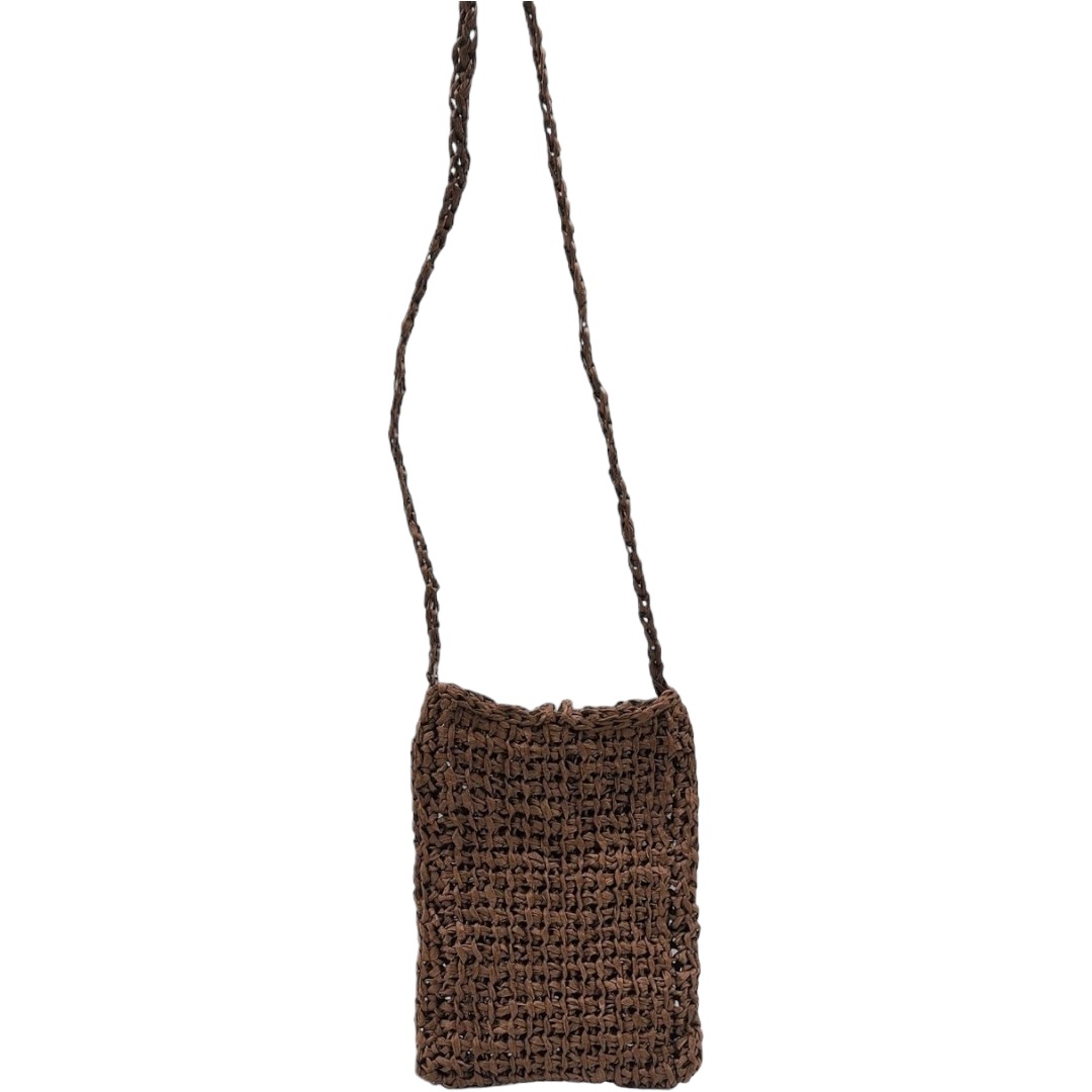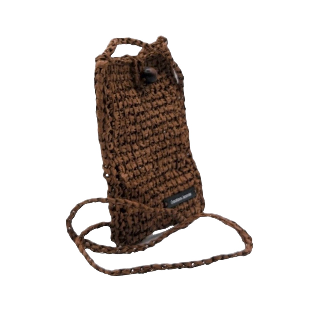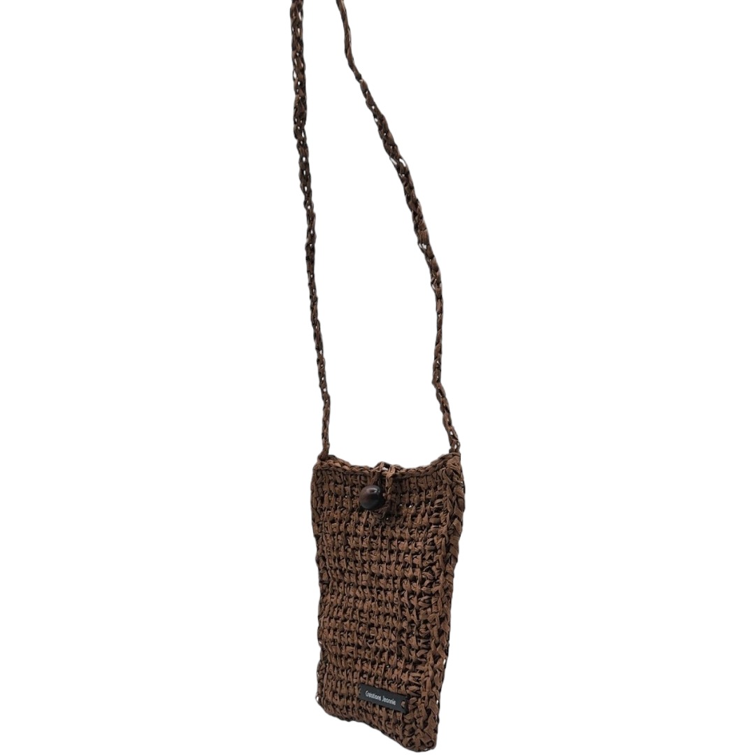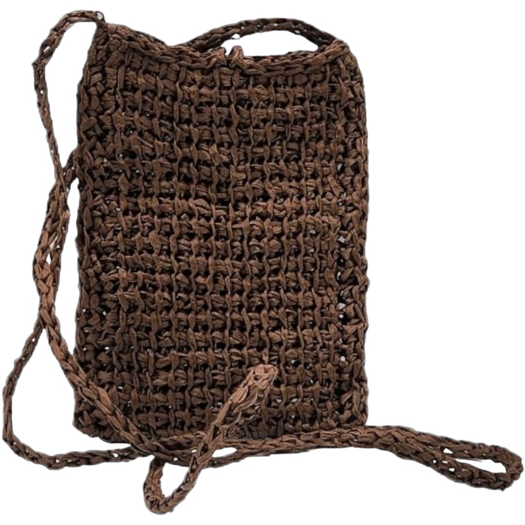 Pochette bandoulière crochetée en raphia papier marron chocolat avec son bouton en perle de bois qui sert de fermeture